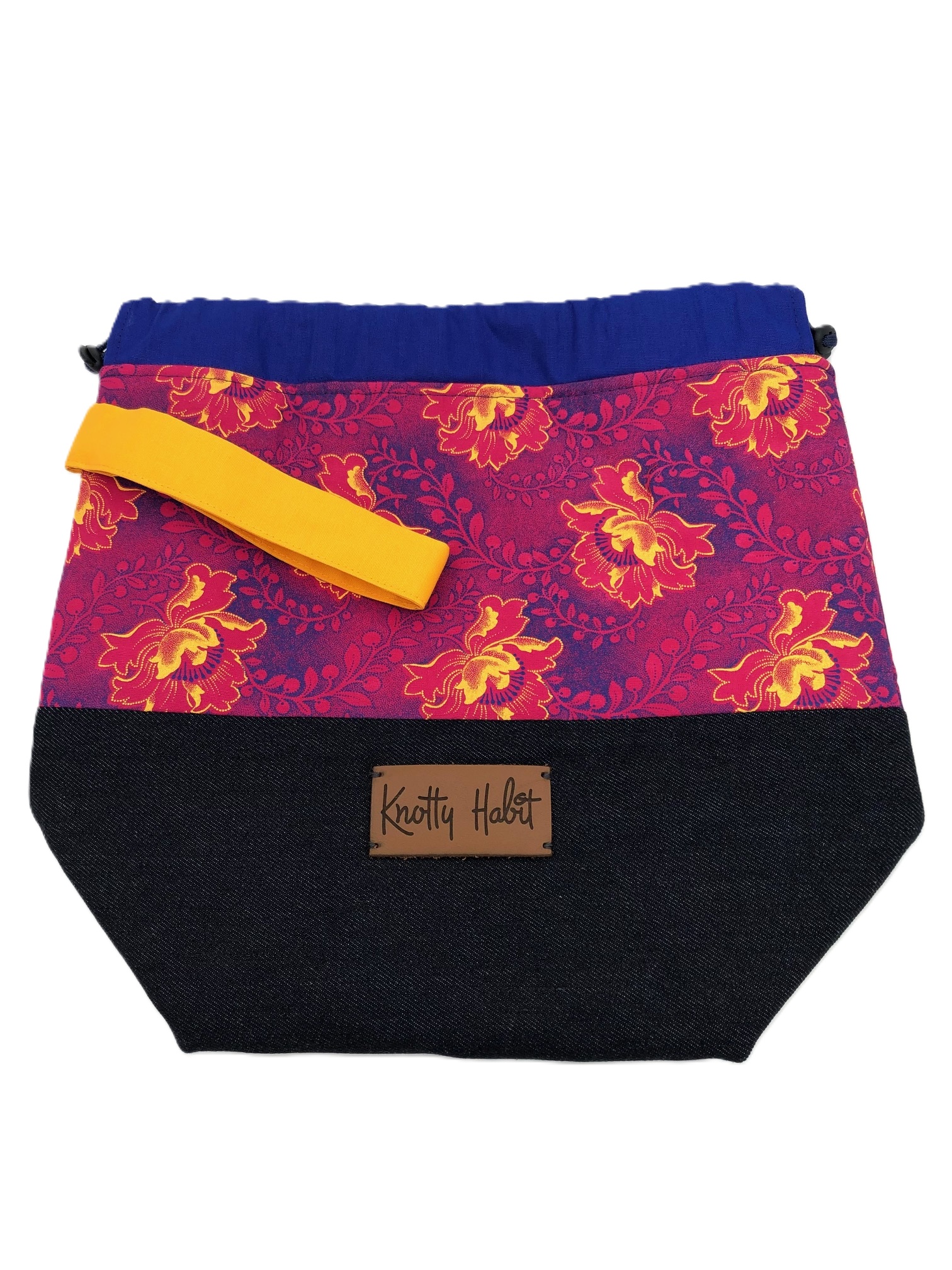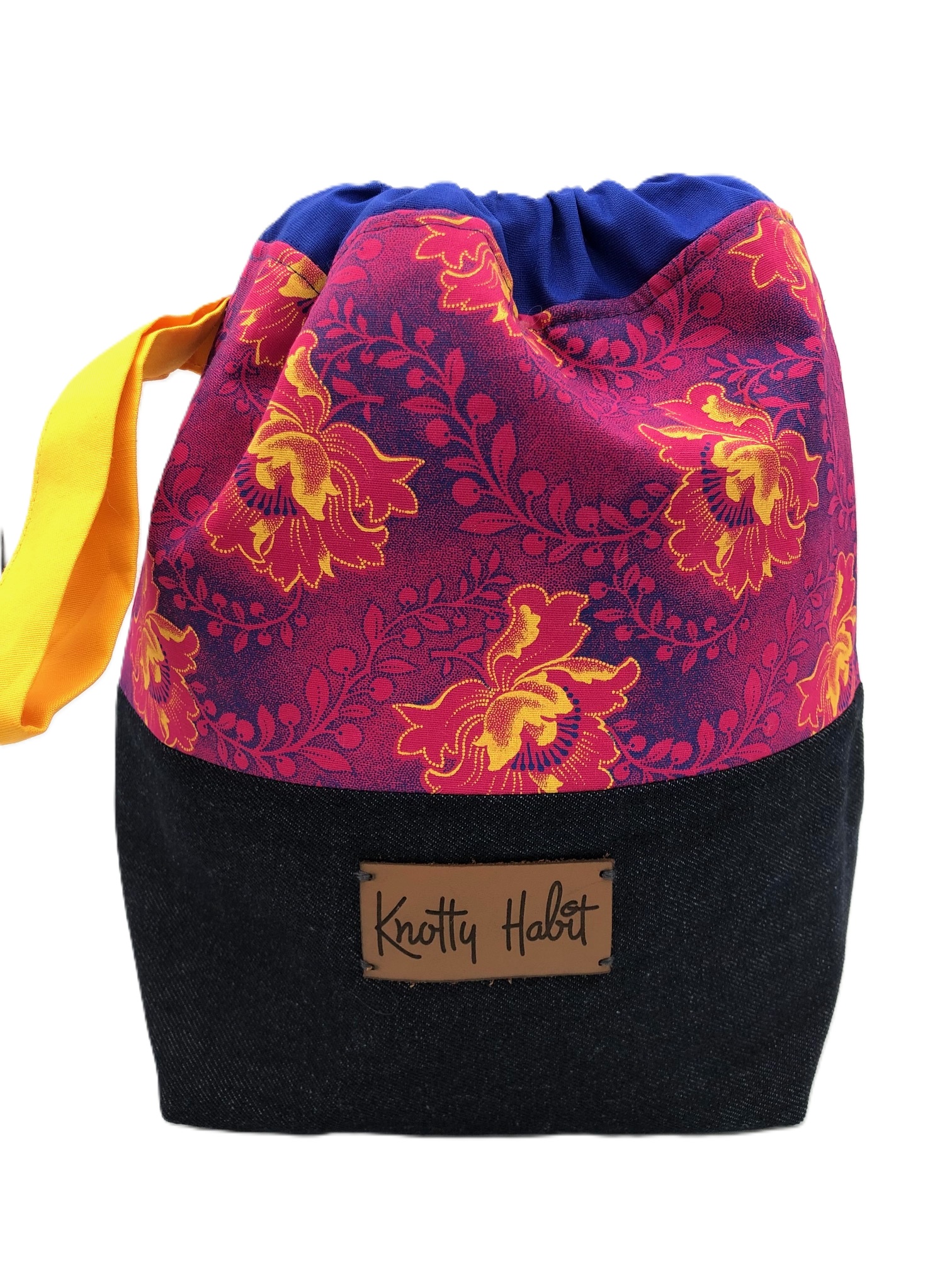 Made from Denim and/or  Shwe Shwe this dual purpose project bag is ideal for taking your work with where ever you go. The bag that is closed with a drawstring is handy to carry your yarn and accessories. The project bag has a boxed bottom and is padded to help it stand upright and has a handle for easy carrying.