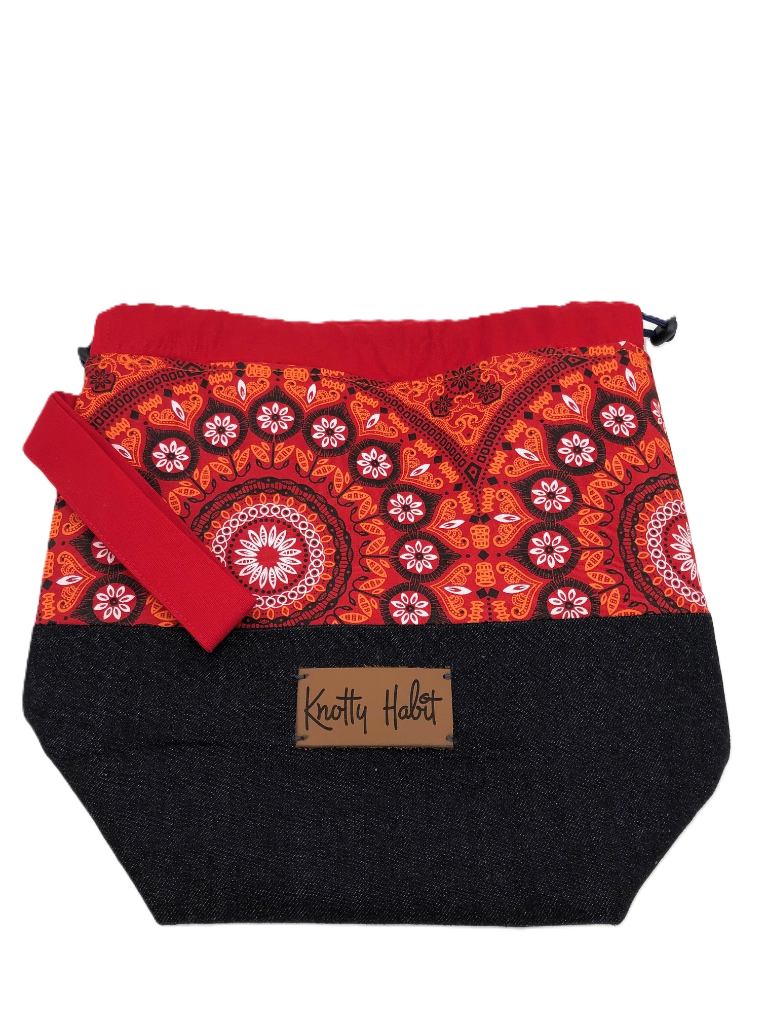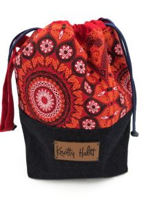 Made from Denim and/or Shwe Shwe this dual purpose project bag is ideal for taking your work with where ever you go. The bag that is closed with a drawstring is handy to carry your yarn and accessories. The project bag has a boxed bottom and is padded to help it stand upright and has a handle for easy carrying.